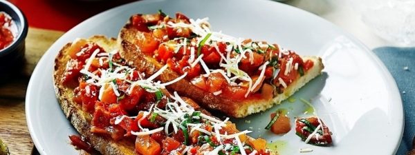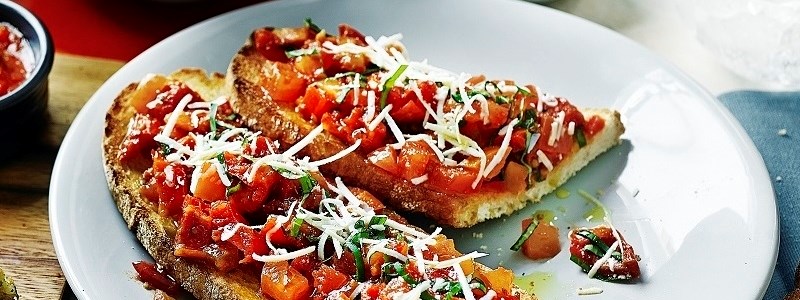Toasted pagnotta bread with marinated tomatoes, fresh basil and ricotta salata.